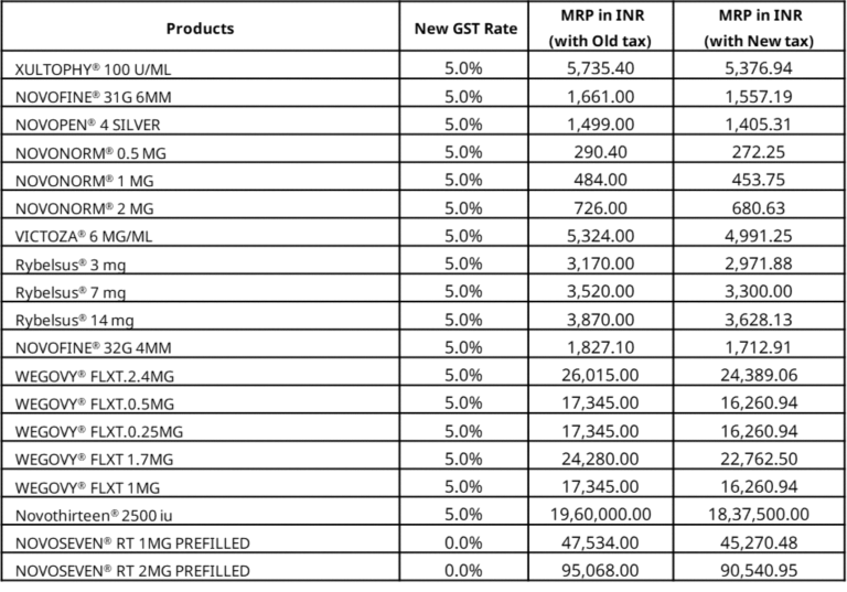 The Government of India has recently unveiled the Next-GEN GST reforms, which will be effective from September 22, 2025. Key changes include a reduction from 12% to 5% GST on most medicines and a nil GST rate on life-saving and critical drugs. Therefore, this public notice is hereby issued by Novo Nordisk India Private Limited to all concerned using or dealing with the following pharmaceutical products. The maximum retail prices (MRP incl. of all taxes) of the products highlighted in the table below will be revised downwards by the reduction in the GST percentage from 12% to 5% with effect from September 22, 2025. The revised MRP incl. of all taxes marketed by Novo Nordisk and distributed by Abbott India Limited is published below.